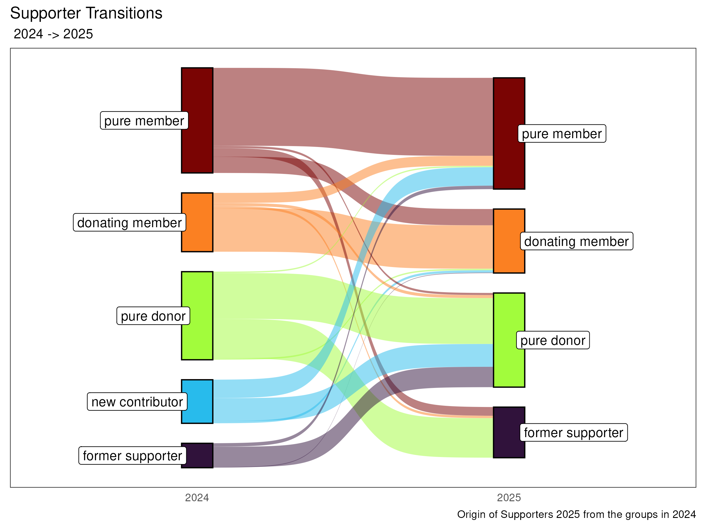 The graph shows the flow of individual supporters from one group in 2023 to the next in 2024.It is part of the automatically generated annual report and is created directly from the fundraising database. (In this case, fictitious data for Trees4Teuto, but this has already been implemented for other databases.)